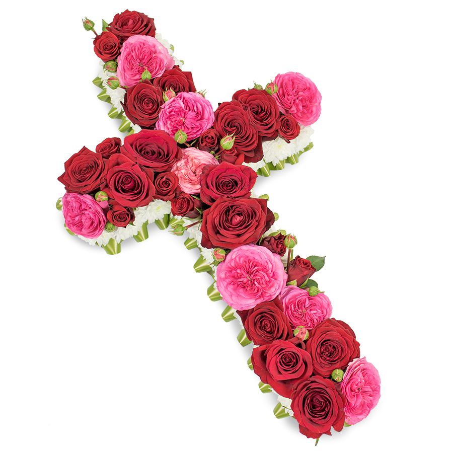 Share your heartfelt condolences with our serene cross-shaped floral arrangement. This elegant bouquet features a beautiful mix of white chrysanthemums, red roses, and pink garden roses, expertly arranged to create a peaceful and meaningful display perfect for any memorial service.