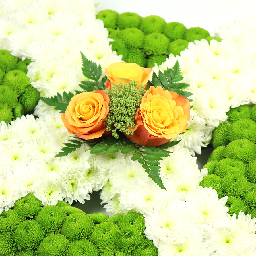 This unique arrangement is made up of white spray chrysanthemums, green spray chrysanthemums, orange roses and greenery. Express your love and care in the most gentle and pure way with this tribute.